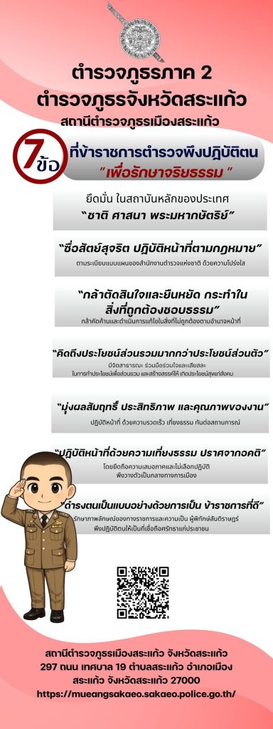 แจกจ่ายอินโฟกราฟฟิกแนวทางการปฏิบัติตนตามประมวลจริยธรรมข้าราชการตำรวจ 25 กุมภาพันธ์ 2569 โดย admin / ไม่มีหมวดหมู่ พล.ต.ต.ถาวร ดุลยวิทย์ ผบก.ภ.จว.สระแก้ว และ พ.ต.อ.ปรีชา สมสถาน รอง ผบก.ภ.จว.สระแก้ว แจกจ่ายอินโฟกราฟฟิกแนวทางการปฏิบัติตนตามประมวลจริยธรรมข้าราชการตำรวจ ให้แก่สถานีตำรวจในสังกัด จำนวน 16 สถานี เพื่อใช้เป็นแนวทางในการปฏิบัติราชการให้เป็นไปด้วยความเรียบร้อยและถูกต้องตามระเบียบ โดยมี พ.ต.อ.สราวุธ เอี่ยมสำอางค์ ผกก.สภ.เมืองสระแก้ว เป็นผู้รับมอบ